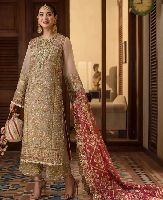 Type :- Suit. Fabric :- Organza. Front:- Organza, hand work, Adda work, Crystal work, Heavy...