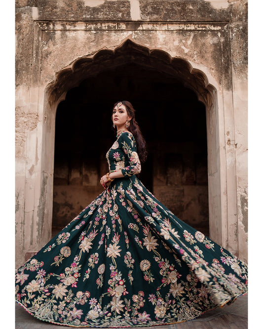 Product Description: This exquisite bottle green lehenga choli set is designed to captivate with its...