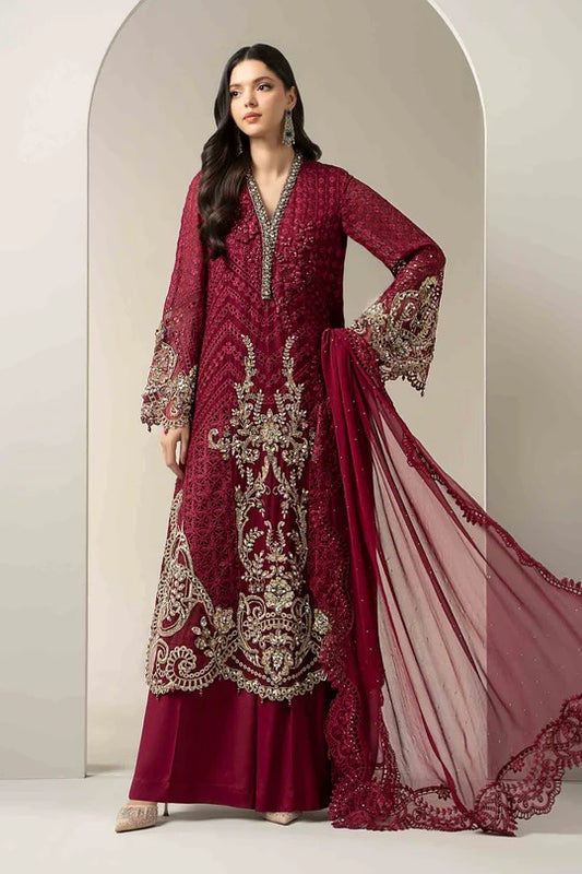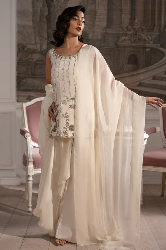 Product Details: Shirt: Embroidered Karandi Gharara: Embroidered Karandi Dupatta: Embroidered Organza Description: Captivating with its refined elegance, Devina...