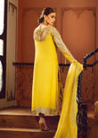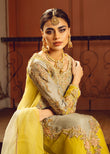 A timeless allure of organza and silk canvas, where Sage and Jade hues intertwine to create elegance. The shirt, is a testament to craftsmanship, adorned with intricate gold embroidery that mimics nature's delicate patterns. The shirt is a modern straight-cut silhouette with an elongated embellished neckline with its ethereal dupatta, a sheer masterpiece featuring delicate motifs mirroring the shirt's design. Together, this ensemble captures the essence of sophistication, seamlessly blending traditional charm with contemporary style for a captivating statement for festivities.