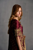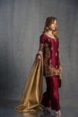 This dreamy outfit is a new staple for the wedding season. Delicate dabki, nakshi and zardozi kaam is complemented with a lama tissue scalloped worked dupatta. Classic silk farshi pants complete the outfit.