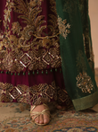 Burgundy Dusk features a meticulously crafted organza net shirt in a rich plum hue. Adorned with intricate kora, dabka, resham, gotta, and sequence work, the delicately hand-embellished sleeves and daaman exude timeless charm. Dreamy blooms in single dhaaga, gota, and zardozi enhance its classic appeal. Paired with an emerald, green pure organza dupatta embellished with sequins spray and floral motifs, and silk izaar pants with heavily detailed borders.