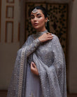 Rendered in cool shade of gray, Dila features elegant floral motifs on the shirt and sleeves. Layered over a crushed sharara and paired with a sheesha embellished dupatta this classic silhouette is ideal for your upcoming festivities.