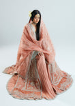 This silhouette brings a modern charm to your wardrobes with its pastel peach and orange color blocking. Further it features crushed sharara adds a texture, with embellished border paired with screen printed dupatta with four side heavy embellished borders.