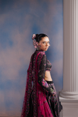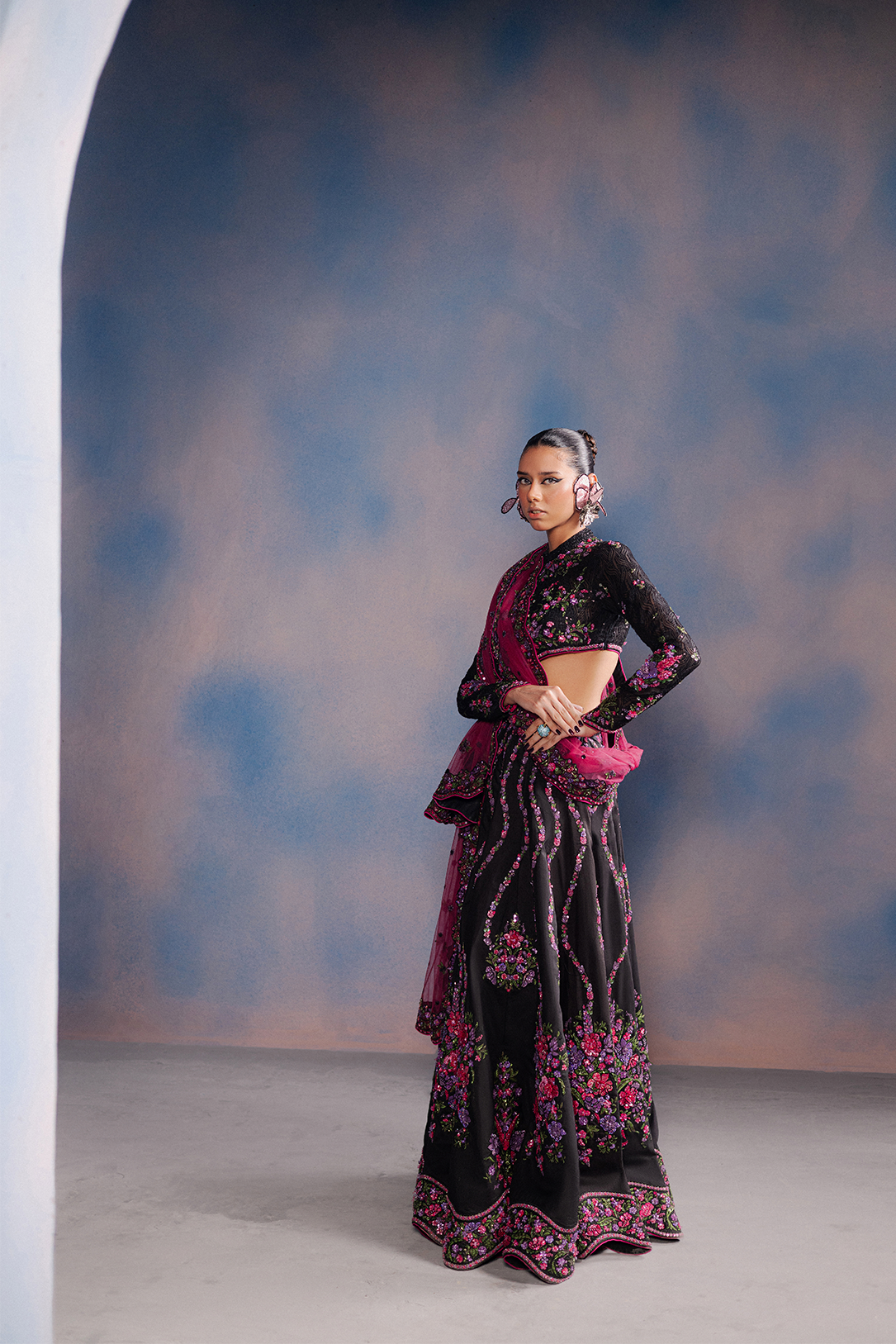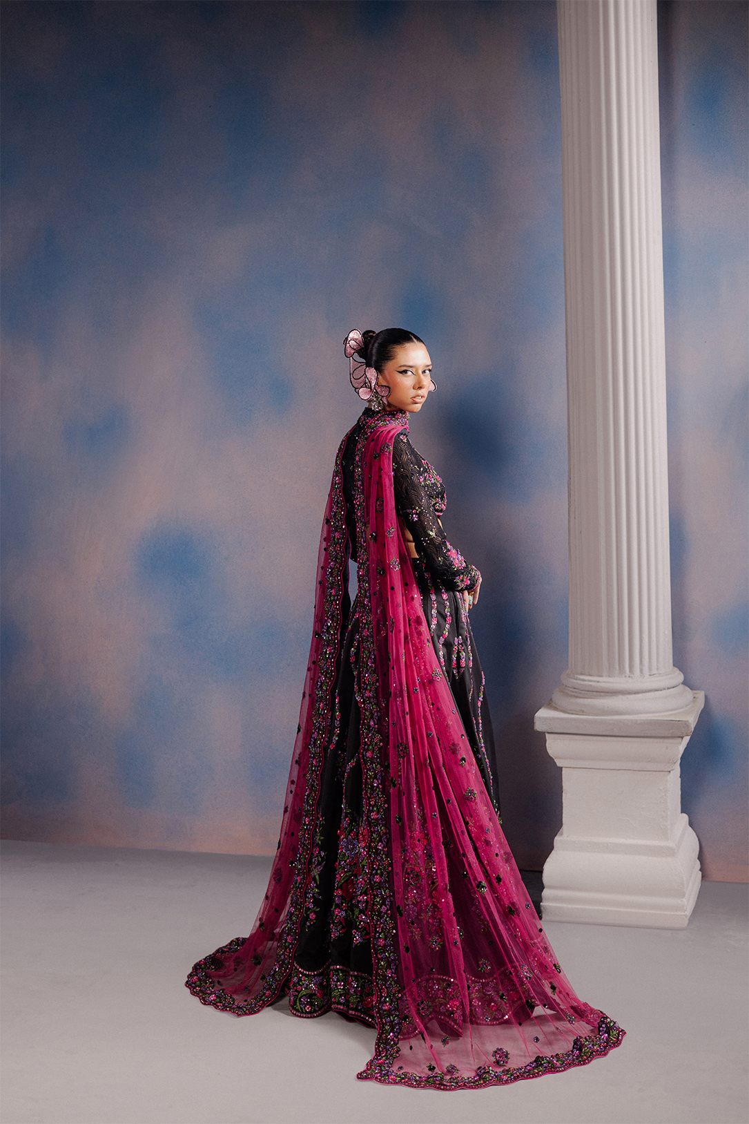 This exquisite black gown radiates majestic allure, featuring a lavishly hand embellished lehenga that evokes a night garden. The design is richly adorned with intricate details, including delicate Swarovski crystals, dabka, zari, cutdana, 3d handmade flowers, sequins, and elaborate beadwork, all contributing to its refined elegance. The gown boasts fully embellished sleeves and a flowing godet skirt that enhances its overall beauty. A stunning, heavily embellished contrasting veil completes the ensemble, adding an extravagant touch. This veil brings a regal and contemporary flair, elevating the look with sophisticated charm.