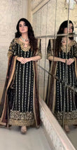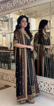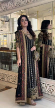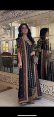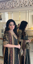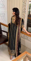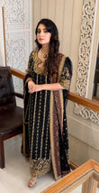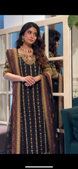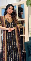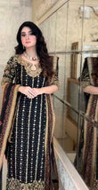 Step into elegance with this intricately embroidered black formal outfit, crafted on premium fabric with luxurious gold hand embellishments. The shirt features detailed threadwork, sequins, and mirror accents, complemented by heavily adorned borders and sleeves. Paired with a matching dupatta and trouser for a complete regal look. Ideal for festive events and formal occasions.