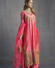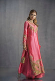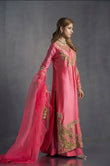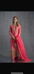 A timeless piece that exudes feminine grace — this vibrant pink formal outfit is adorned with exquisite golden embroidery and intricate hand embellishments. The soft, flowy fabric is detailed with delicate zari work and sequins on the neckline, sleeves, and hem, giving it a rich festive look. Styled with a matching dupatta and trousers, this ensemble is perfect for weddings, festive dinners, and formal events.