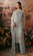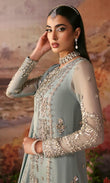 A pastel masterpiece of powder blue featuring silver handwork on chiffon, paired with an intricately hand worked motifs on bottom and a sequined bordered dupatta for a sophisticated look.