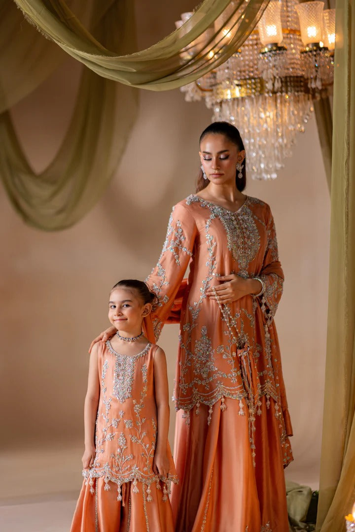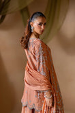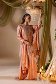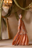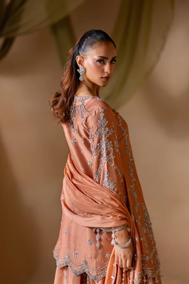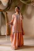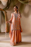 The back is adorned with a scalloped edged border and scattered booti detailing. Paired with a wide two-legged panelled sharara, detailed with flowing charriyan and a patterned finishing border. The look is completed with a complementing medium silk dupatta featuring detailed bunches, bordered scalloped edges, and a sequins spray ,adding just the right touch of elegance and color harmony.