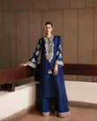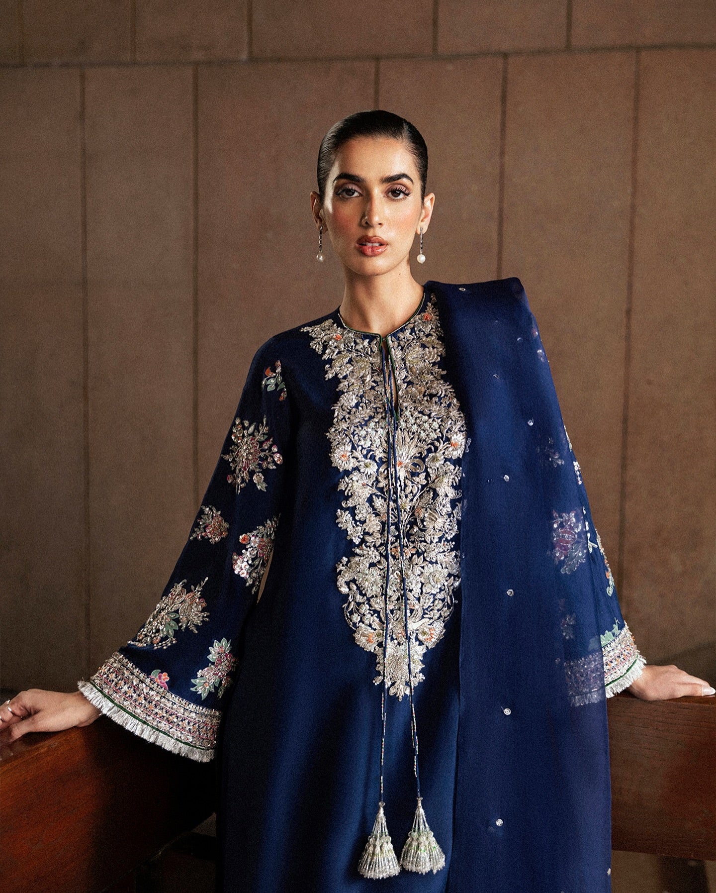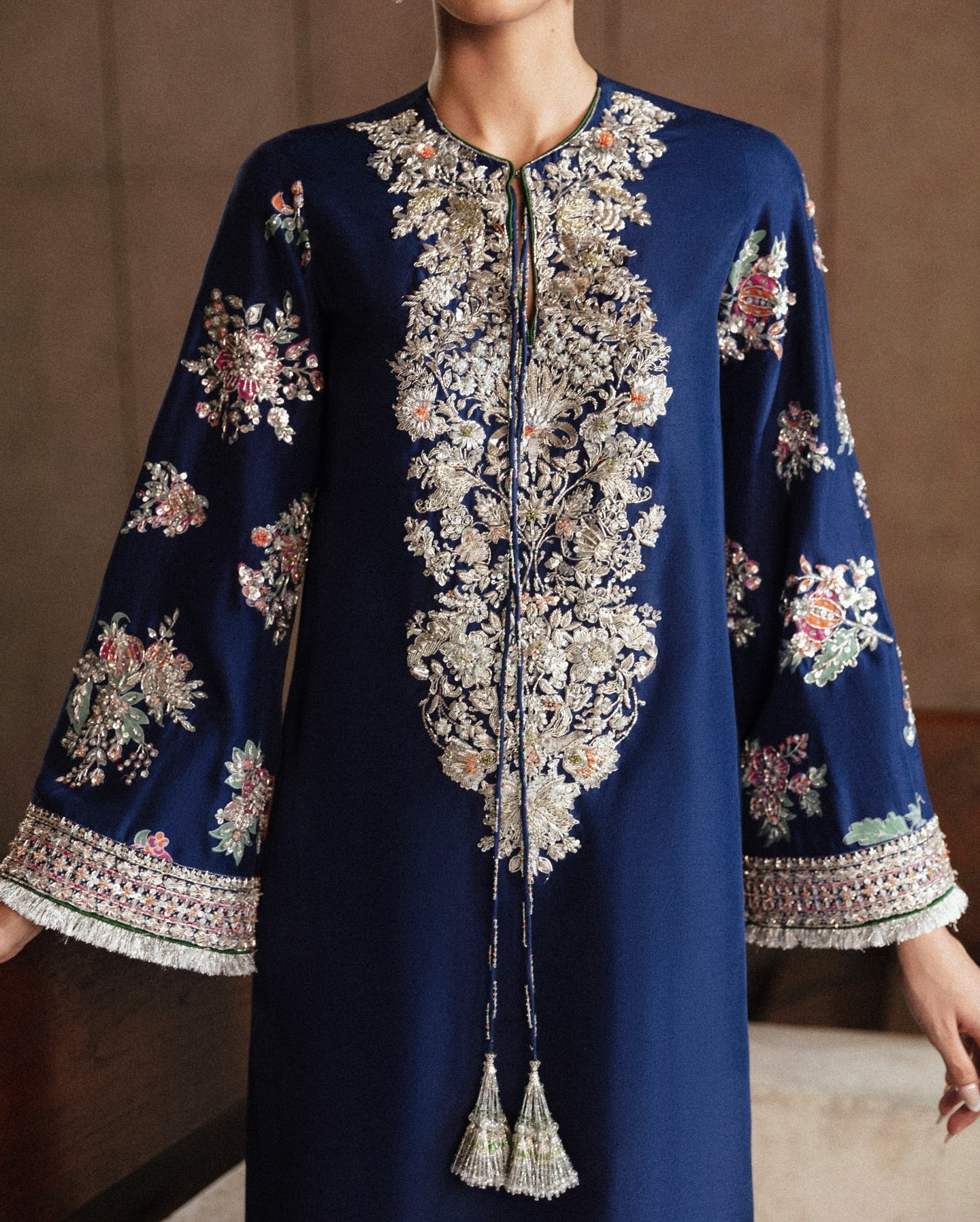 This classic navy blue raw silk long shirt has embellishment details of silver nakshi, sequins, gota, mukesh , orange , ice blue and green cut dana on neckline. The sleeves are heavily embellished with pink , orange and green sequins, cutdana and silver kiran at the hem. It’s paired with red raw silk palazzo pants with borders embroidered and embellished with silver sequins,naqshi,bugglebeads and pipes The outfit contains 3 yards organza dupatta with sequin spray all over.