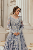Grandeur iced blue net peshwas with royal tail features signature hand embroidery, finished with handwork and glistening sequins. The look will give you head-turning, timeless charm, whatever the season. The ensemble is paired with an embellished net dupatta with detailed borders paired with larger-than-life veil with intricate detailing
