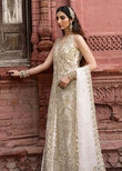 This elegant ivory ensemble features a straight shirt with a front open slit, paired with a sharara and dupatta. The shirt, crafted from luxurious Kathan organza, is meticulously hand-embellished with a dazzling array of sequins, crystals, naqshi, and dabka, creating a radiant and intricate design. It is beautifully complemented by a lawn silk sharara that adds a touch of richness and flow. The look is completed with a Kathan organza dupatta, adorned with a mesmerizing spray of sequins that enhances its ethereal charm. This ensemble is perfect for making a sophisticated and unforgettable statement at any special occasion.