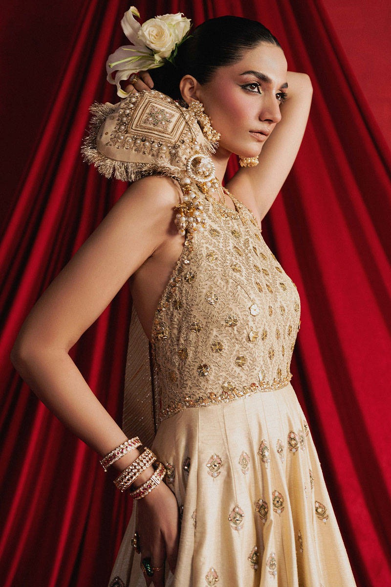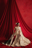 Introducing the exquisite Ivory Grace embroidered silk 3-piece suit, a masterpiece inspired by traditional Mughal artistry. Crafted from fine Indian silk, this ensemble showcases intricate adda embroidery, silk appliqué, and glimmering mirror work. The choli features elegant jaali-inspired detailing, while the flowing lehenga displays ascending Mughal motifs and rich floral embellishments. Paired with an organza dupatta adorned with sequins, gota borders, and soft golden kiran finishing, this outfit embodies timeless sophistication and cultural heritage.