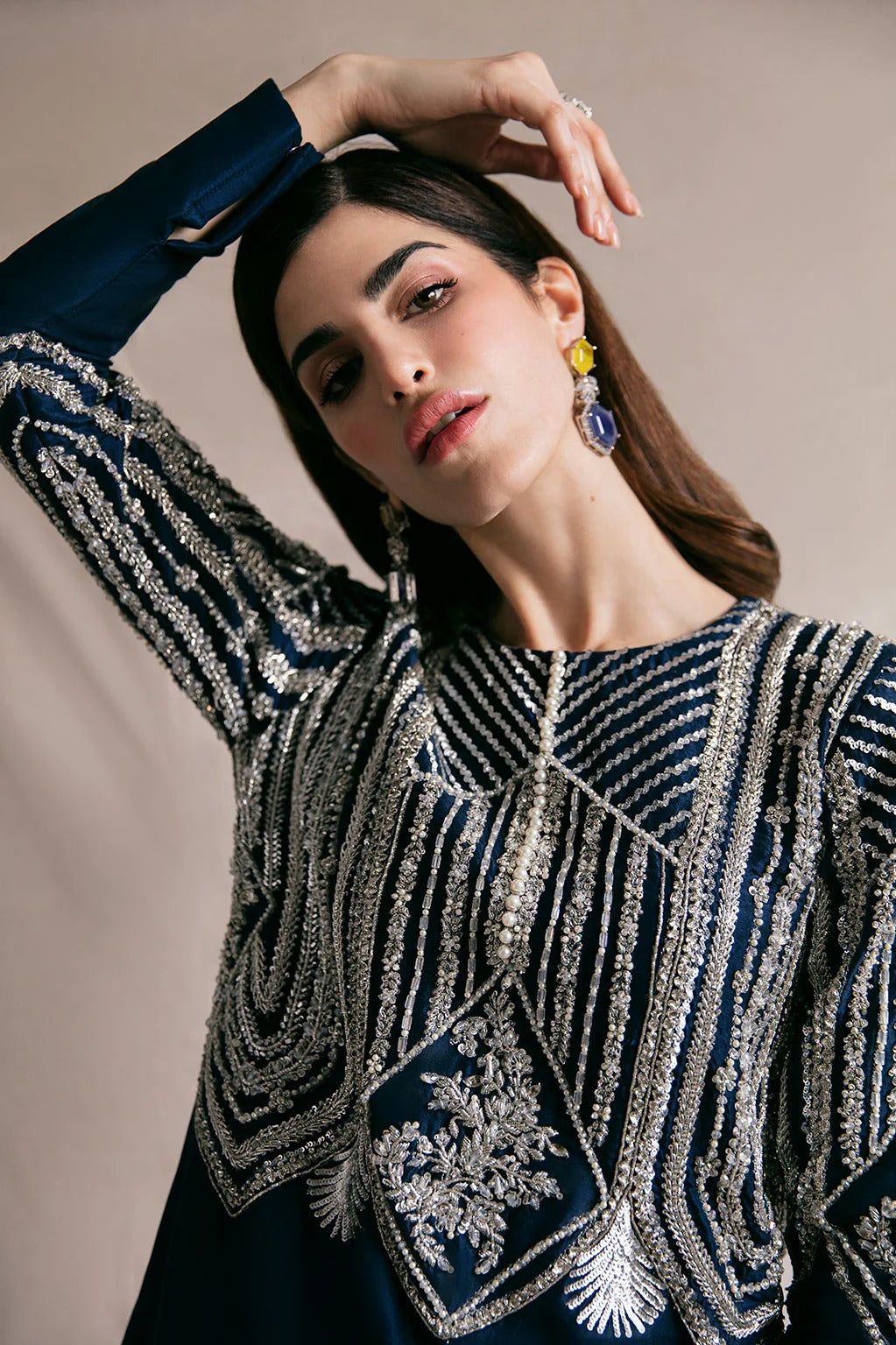Description: Embrace the essence of your impeccable taste and unwavering sense of style in our navy blue ensemble. In the rich hue of navy blue, this outfit effortlessly captures the essence of refined allure. The floor-length straight shirt is tailored to perfection in the finest raw silk fabric and is meticulously adorned with silver hand embellishments on the bodice and sleeves, optimising timeless elegance and artistry. Harmoniously paired with silk cigarette pants, this creation is a masterpiece that transcends boundaries.