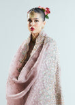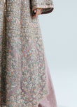 A dainty Lavender-pink silhouette, lavishly adorned with intricate embellishments on the front and back bodice and panels, created an alluring look. Heavy embellished jacket evoking a royal look, accompanying this divine piece with embellished seuins spray draping gracefully and exuding a fairy-tale like aura. Completing this enchanting ensemble with the embellished dupatta, featuring celestial motifs in mesmerising hues.