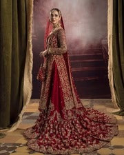 A three piece bright red bridal featuring traditional floral motif and vines rendered using dabka, marori, resham zardozi among other techniques.