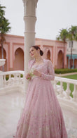 Reflecting the sophistication of a floor sweeping silhouette, Ruzova is a celestial assemblage of time-honoured crafts. The powder pink net pishwas dazzles with intricately crafted tilla and sequin motifs delicately arranged in blooming floral patterns that are highlighted with every step. This piece comes with a silk churidar and an artistically adorned sheer net dupatta making it a true treasure of your festive wardrobe.