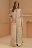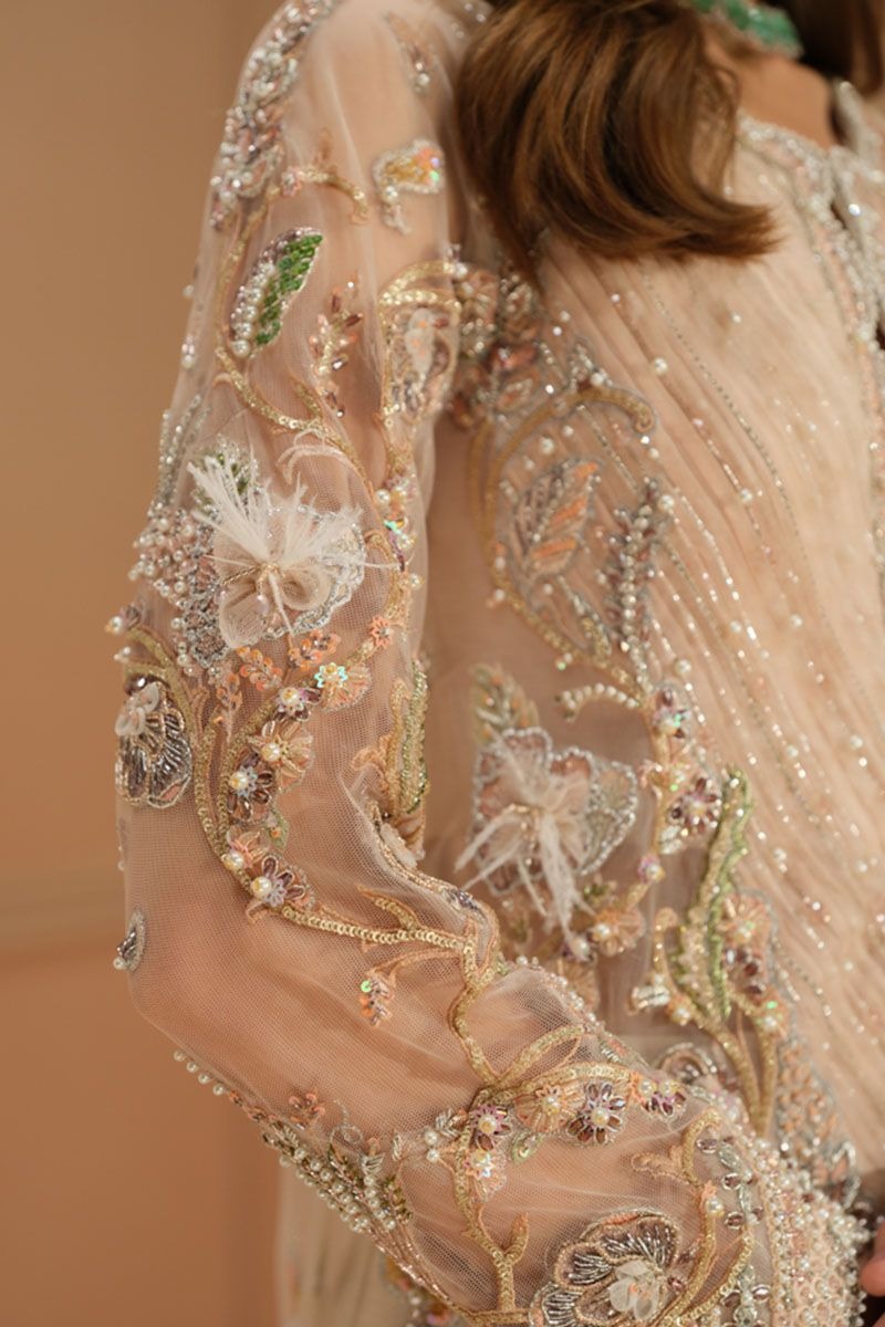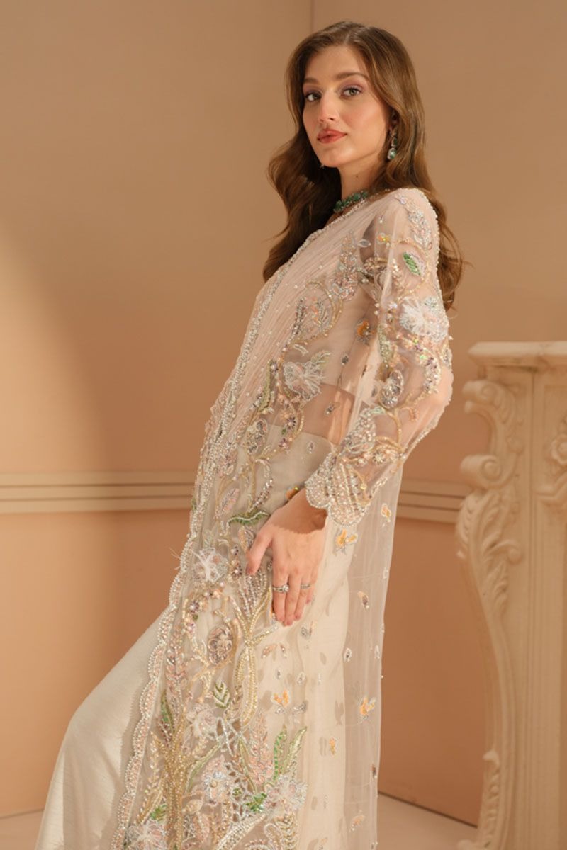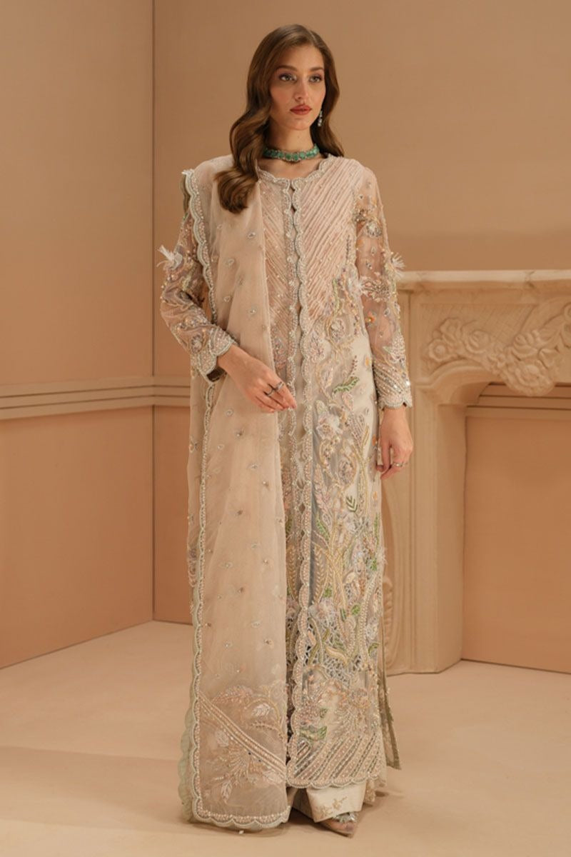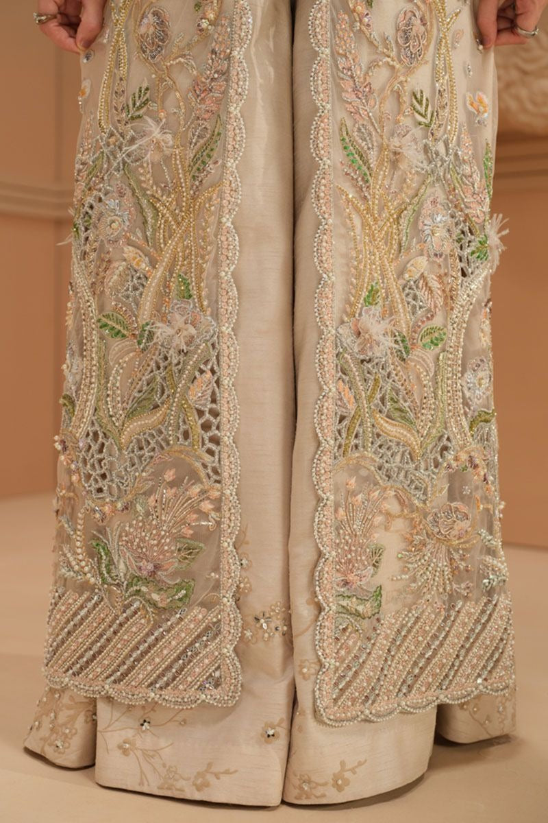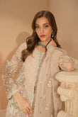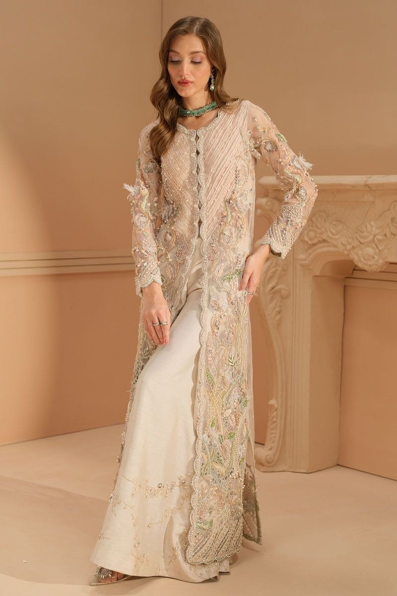 This exquisite soft beige ensemble embodies sheer sophistication and modern elegance. It features delicate beadwork, thread embroidery, and subtle sequins that create a dreamy, ethereal effect. The organza fabric adds a touch of lightness, while the scalloped detailing along the neckline and front enhances its refined charm. Perfect for formal events, engagements, or festive soirées, this outfit radiates understated luxury and timeless beauty.