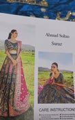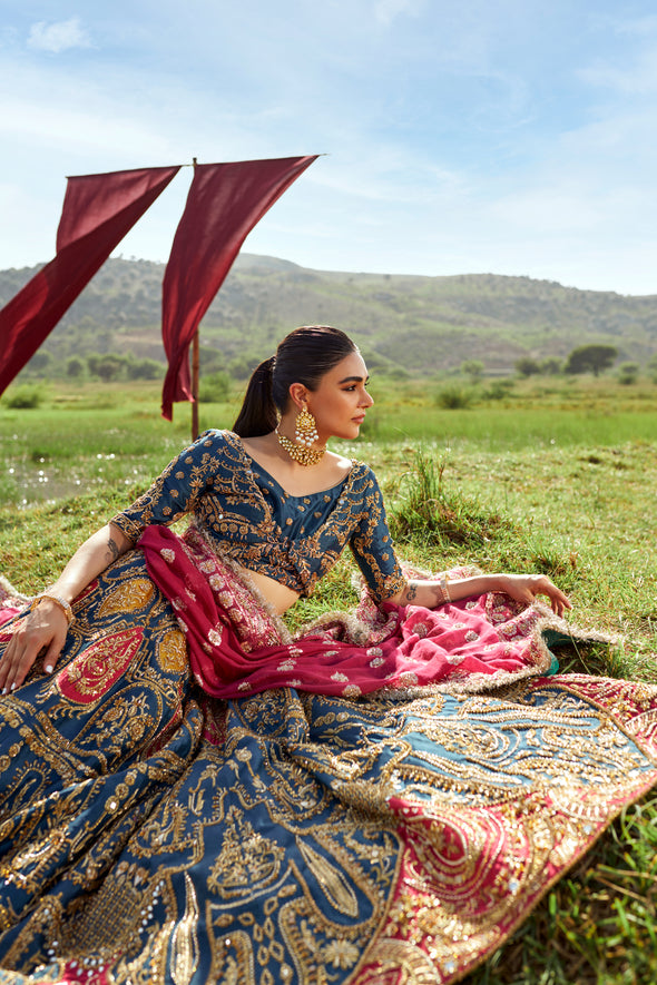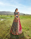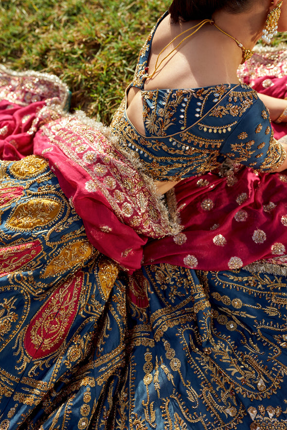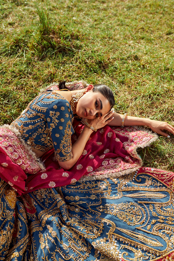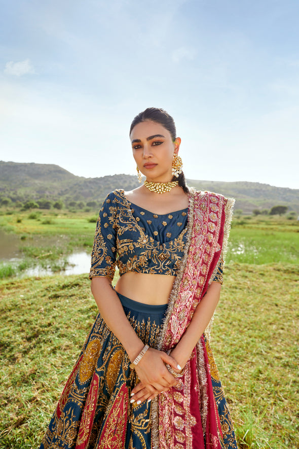 Suraz from 𝐃𝐡𝐮𝐧 features a multi coloured lehnga choli with a teal fabric painted graciously over by copper gold intricacies and hints of coral oozing through. It is paired with a worked maroon dupatta that adds to the vibrant beauty. 💙