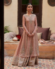 An alluring shade of pink is used as a canvas for a knee length kameez and sharara set. This feminine silhouette is ornamented with pearls, naqshi and dabka. Paired with an embroidered sharara and dupatta, the set is a staple for this season’s traditional affairs.